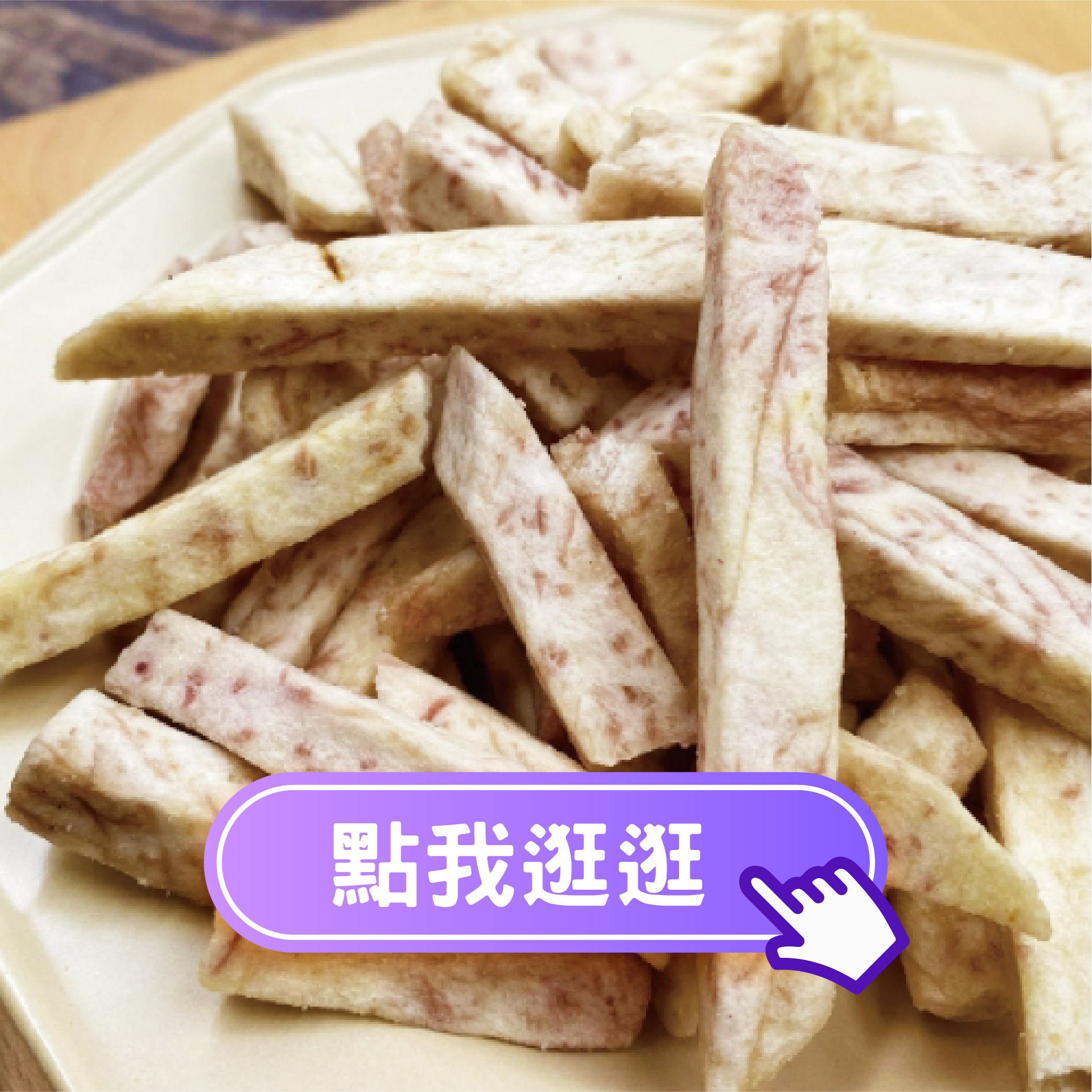 常見如:秋葵脆片、芋頭條、秀珍菇脆片、紅蘿蔔脆片、牛蒡片、敏豆條等。